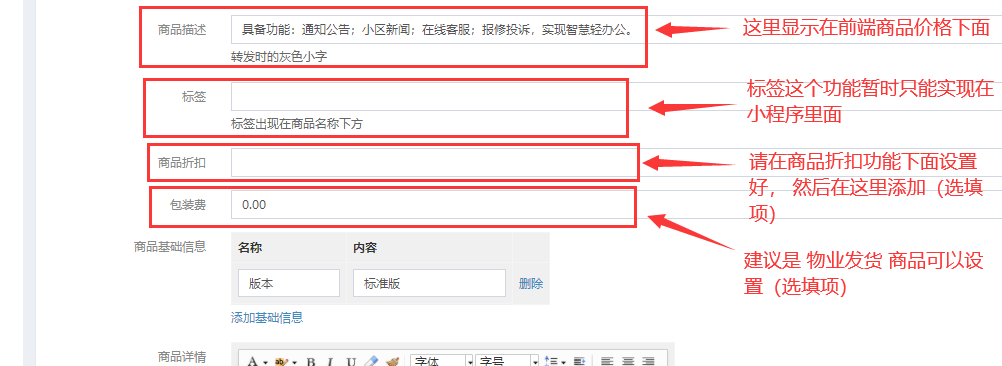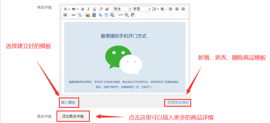 商品详情,可设置好模板,直接在这里插入(适用于多个商品有相同的商品详情),或者直接在这里编辑商品详情