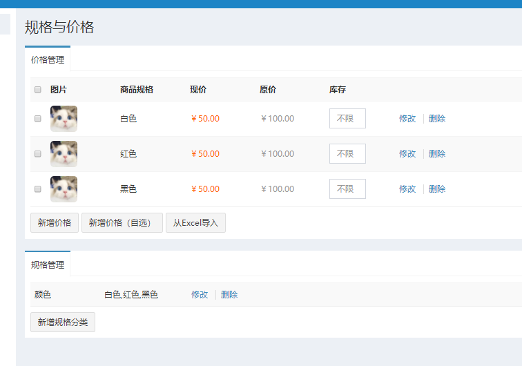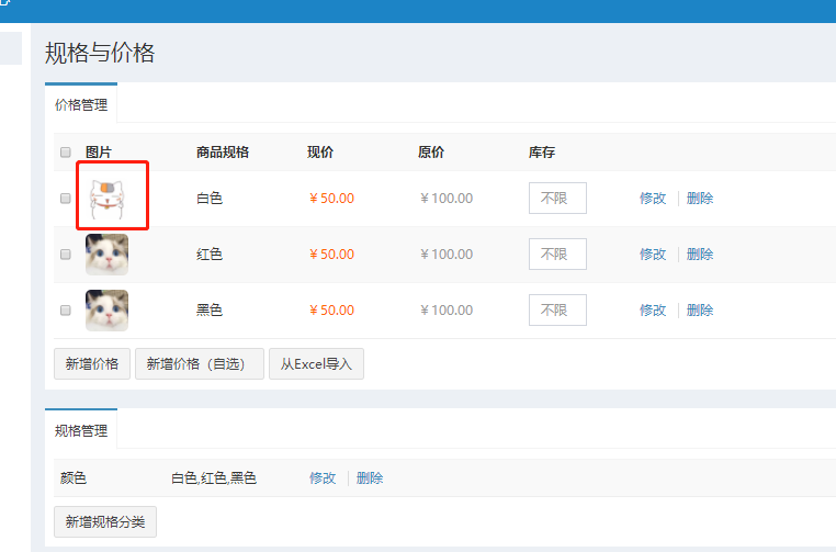 这就是刚才新增的商品规格,可多选规格一起添加价格