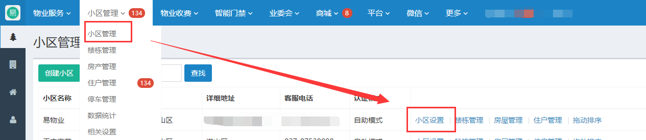 1、点开易物业后台,小区管理——小区设置,可给每个小区设置不同的关注回复