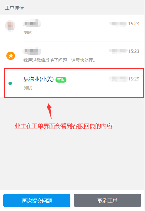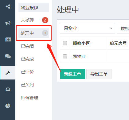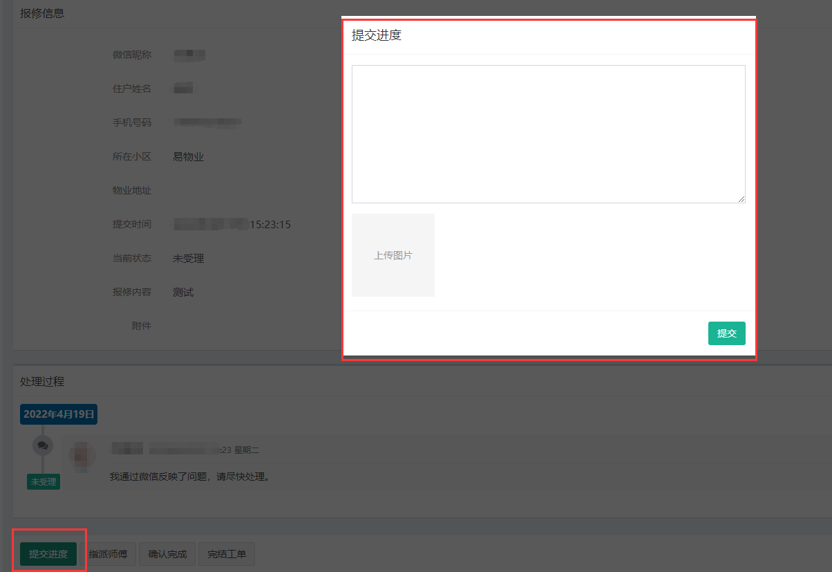 <br>电脑端后台可以看到工单受理后(指给业主回复消息或者指派师傅等操作),工单会出现在“处理中”,客服可查看“提交进展”