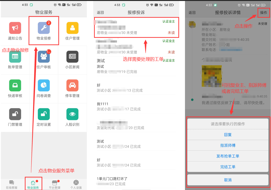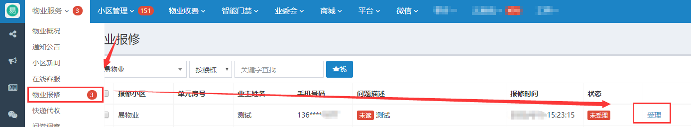 点击物业服务——物业报修,点击业主工单后面的“受理”