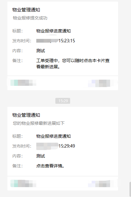 指派给师傅后,师傅会收到模板消息提示,点击模板消息进入工单界面,可回复业主文字、图片或者完结工单