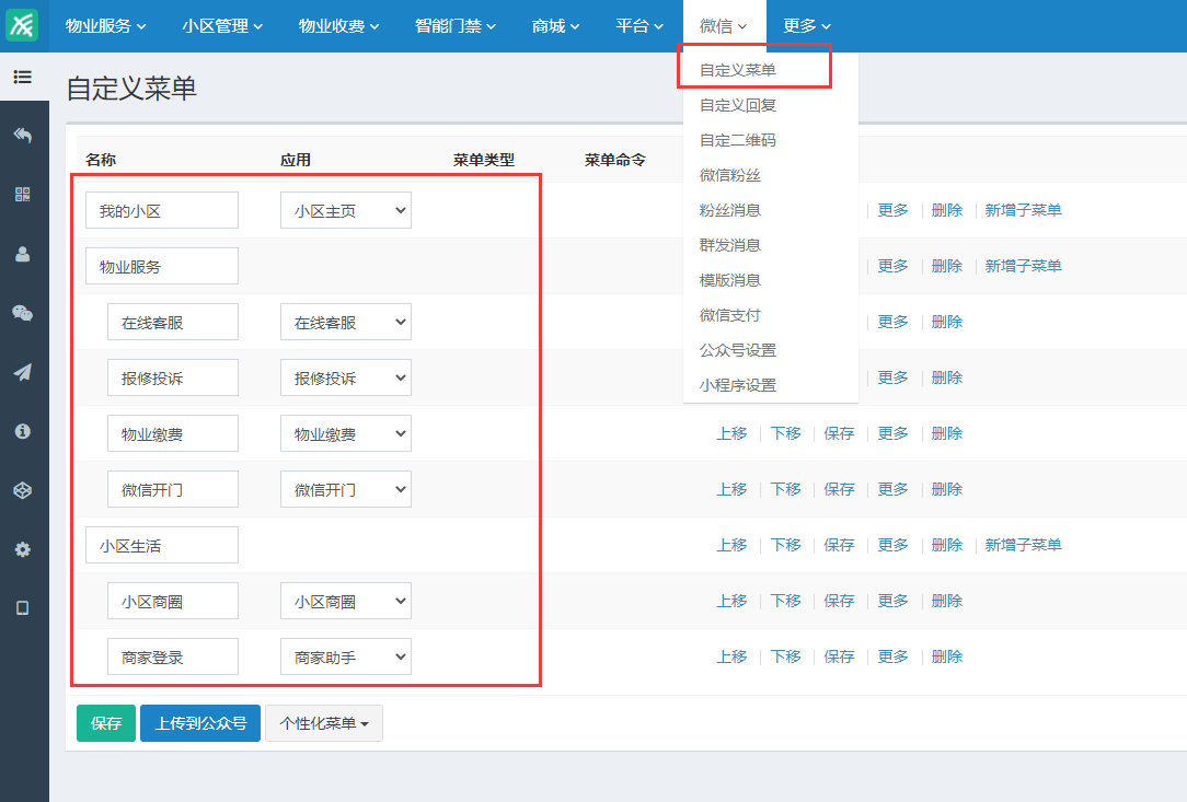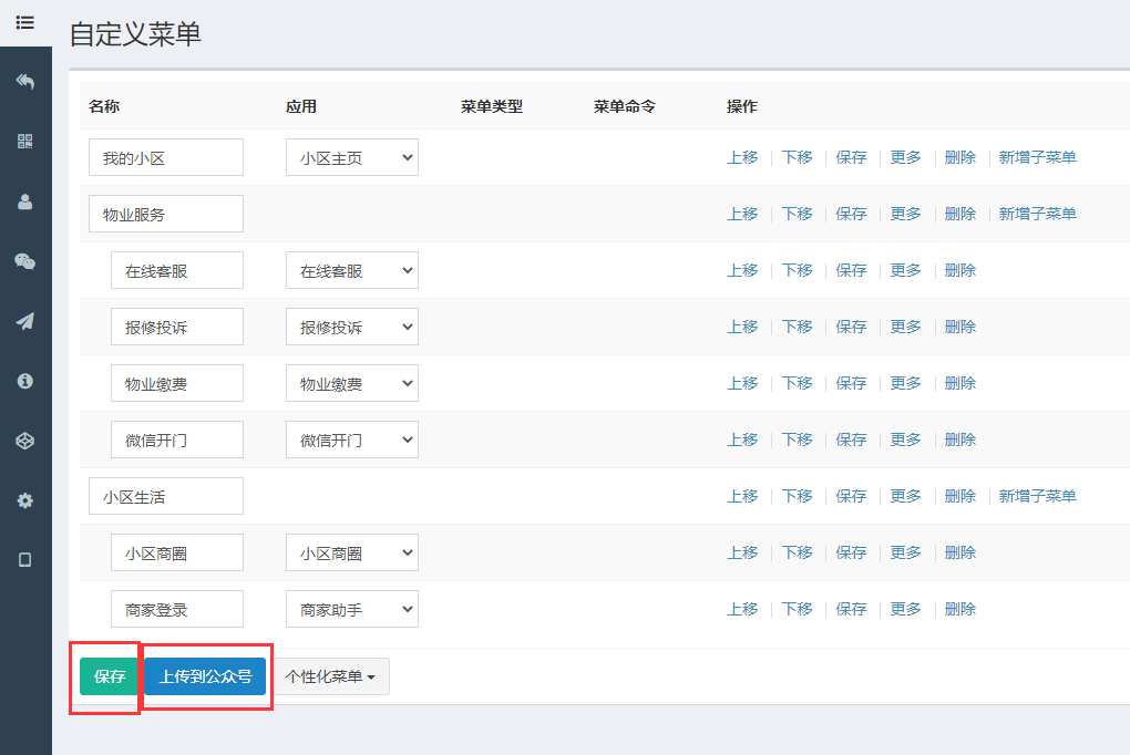 可以点击 保存——上传到公众号,这样公众号的菜单就会变成后台设置的菜单