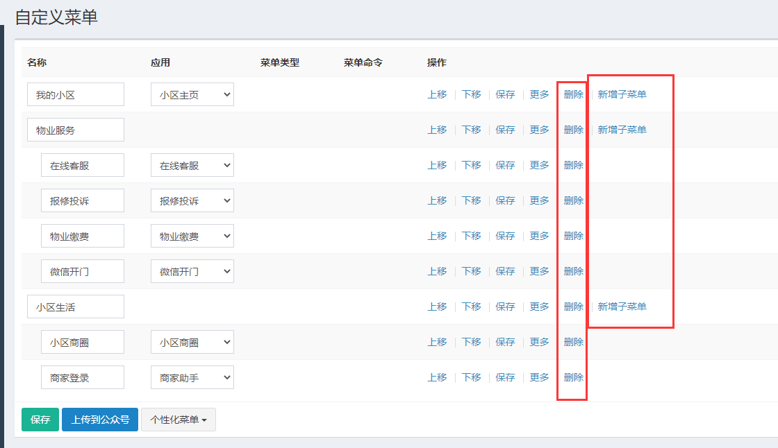 如果需要更改,请点击菜单后面的新增子菜单、删除功能