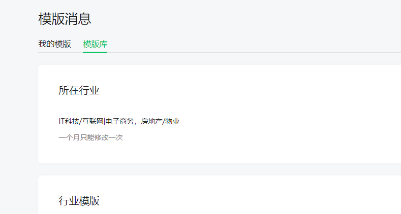 如果是新申请的公众号,还需要申请模板消息功能,申请下来之后才能选择行业