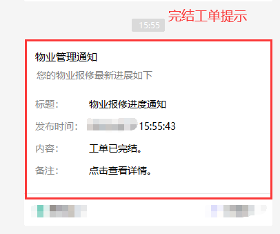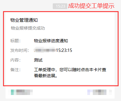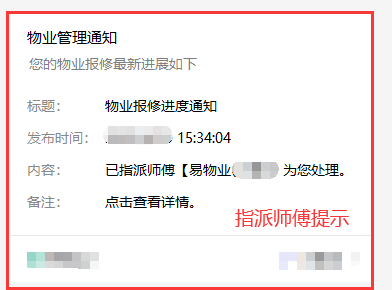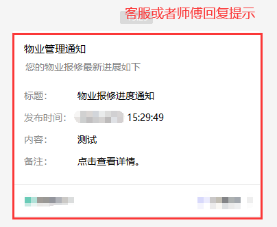 提交后,客服会在电脑端后台或者APP收到提示进行处理,业主则会在公众号里面收到客服或者师傅回复的内容模板消息通知,点击模板消息可查看最新报修进度