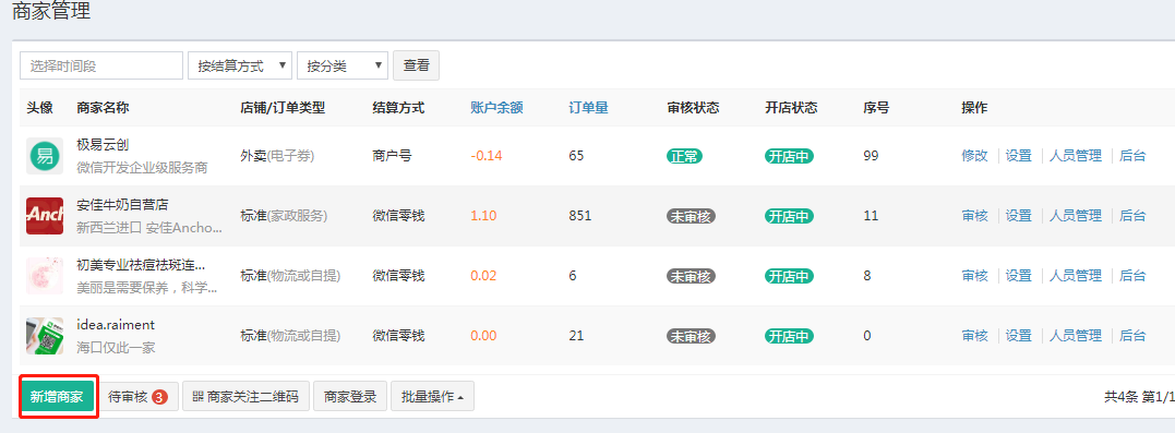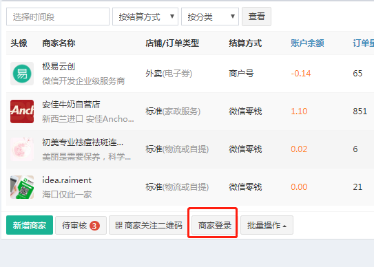 (3)线下结算:无条件,设置之后订单的金额不会显示在线上商家账号余额里面,需要平台跟商家沟通,比如一个月结一次账,在商家后台选择1月到31号,查看金额,然后把钱线下给到商家