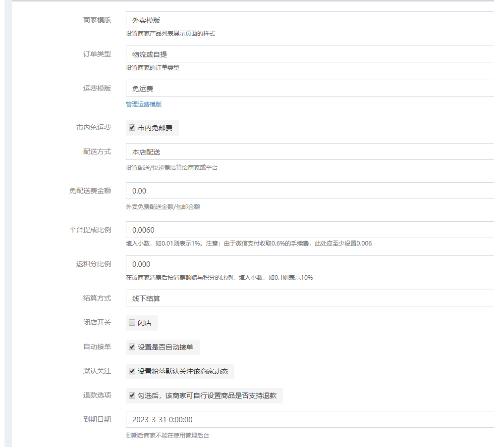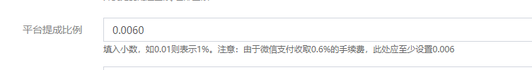 **平台提成比例**:由于微信的手续费是千分之六(根据申请行业不同,手续费不同,最低是千分之六),这里设置0.006,就是商家自己付手续费,如不设置,手续费则是平台承担
