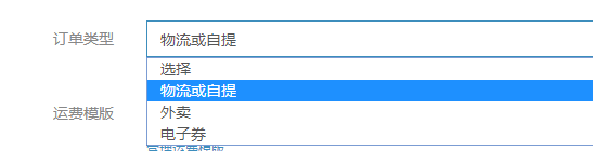 **订单类型**:分为“物流或自提”、“外卖”、“电子券”商家