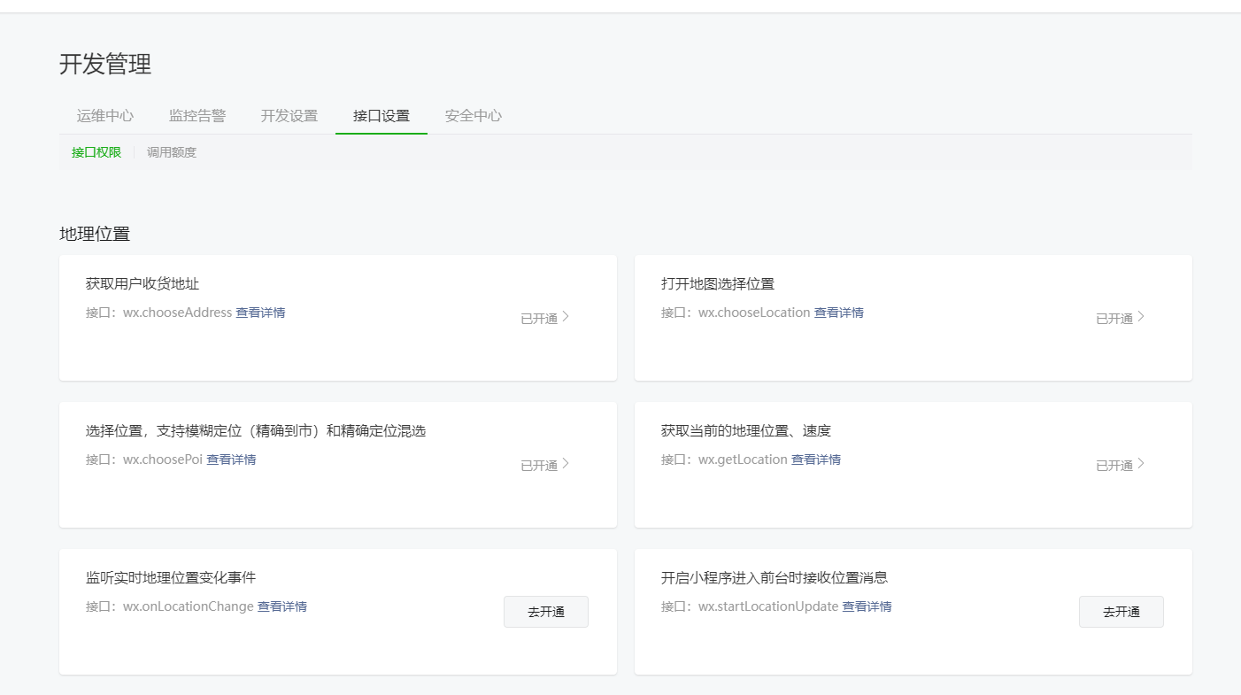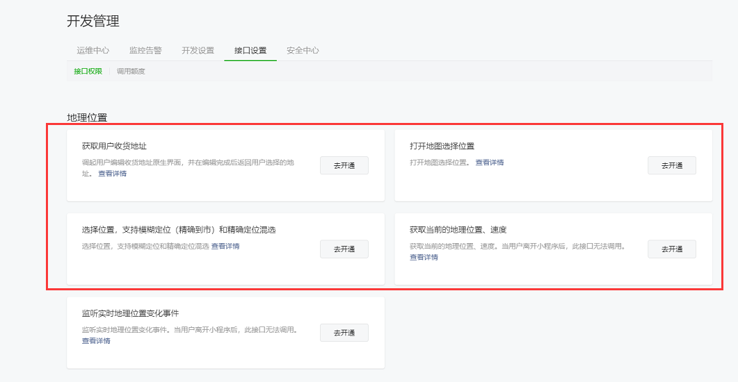 (2)选择下面四个功能端口开通(获取用户收货地址,打开地图选择位置,获取当前的地理位置、速度)