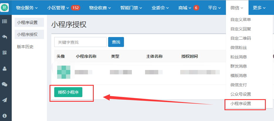 <br>3、易物业后台,微信——小程序设置,进行扫码授权