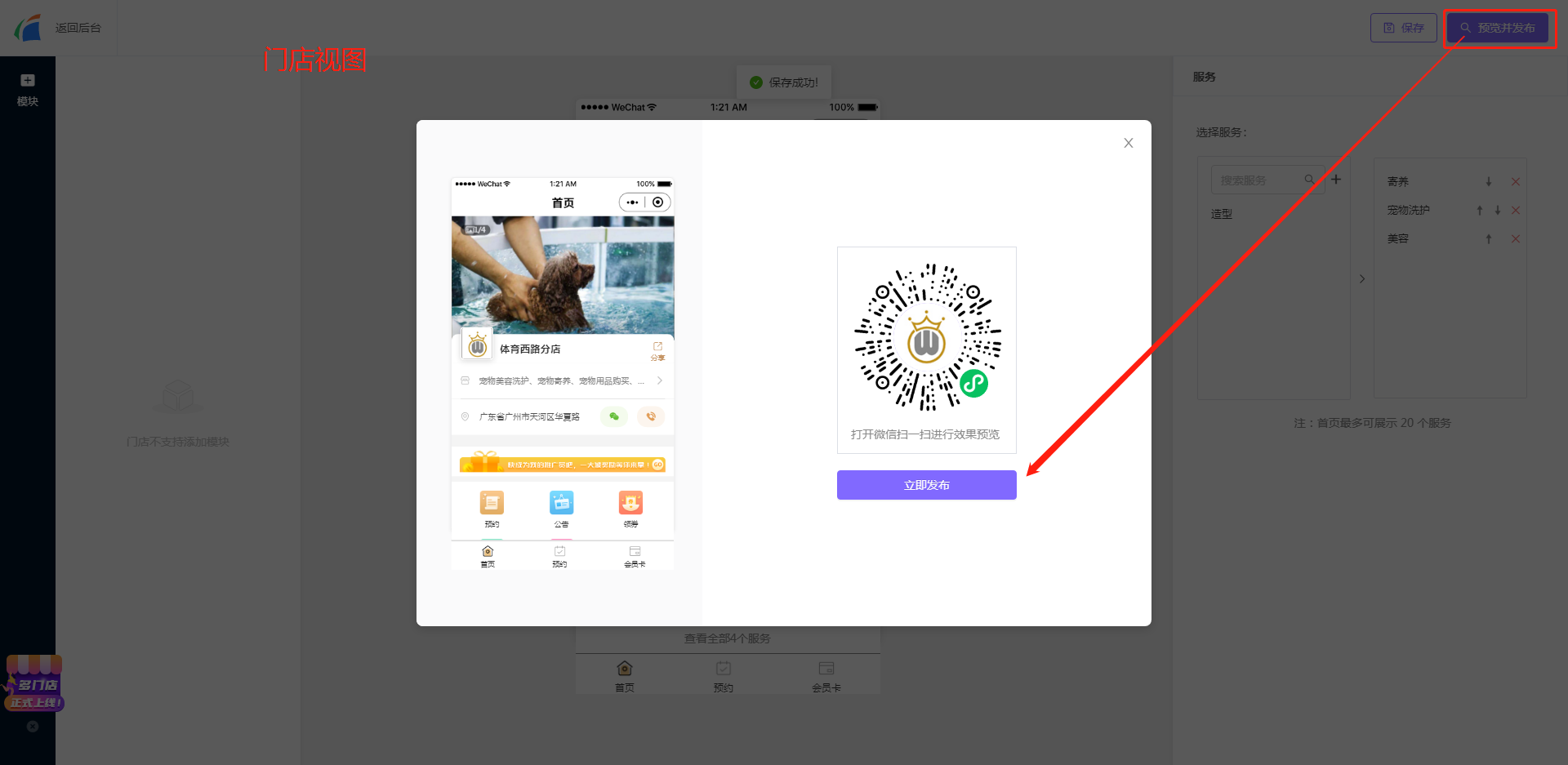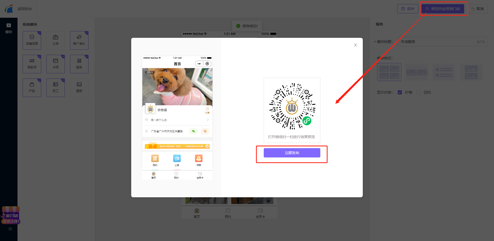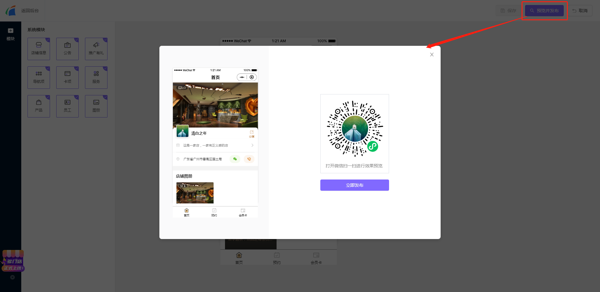 点击预览并发布可扫码预览当前的装修效果,确认“立即发布”后,会替换店铺小程序当前的装修样式。