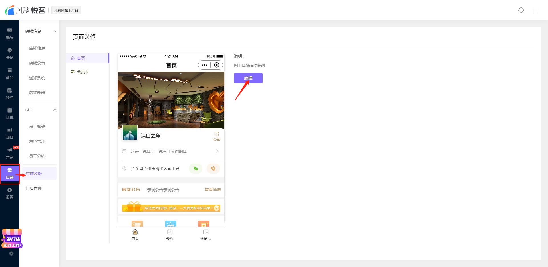 总部制定好统一的装修样式后,需应用到门店,门店则会拥有总部同样的模块和样式