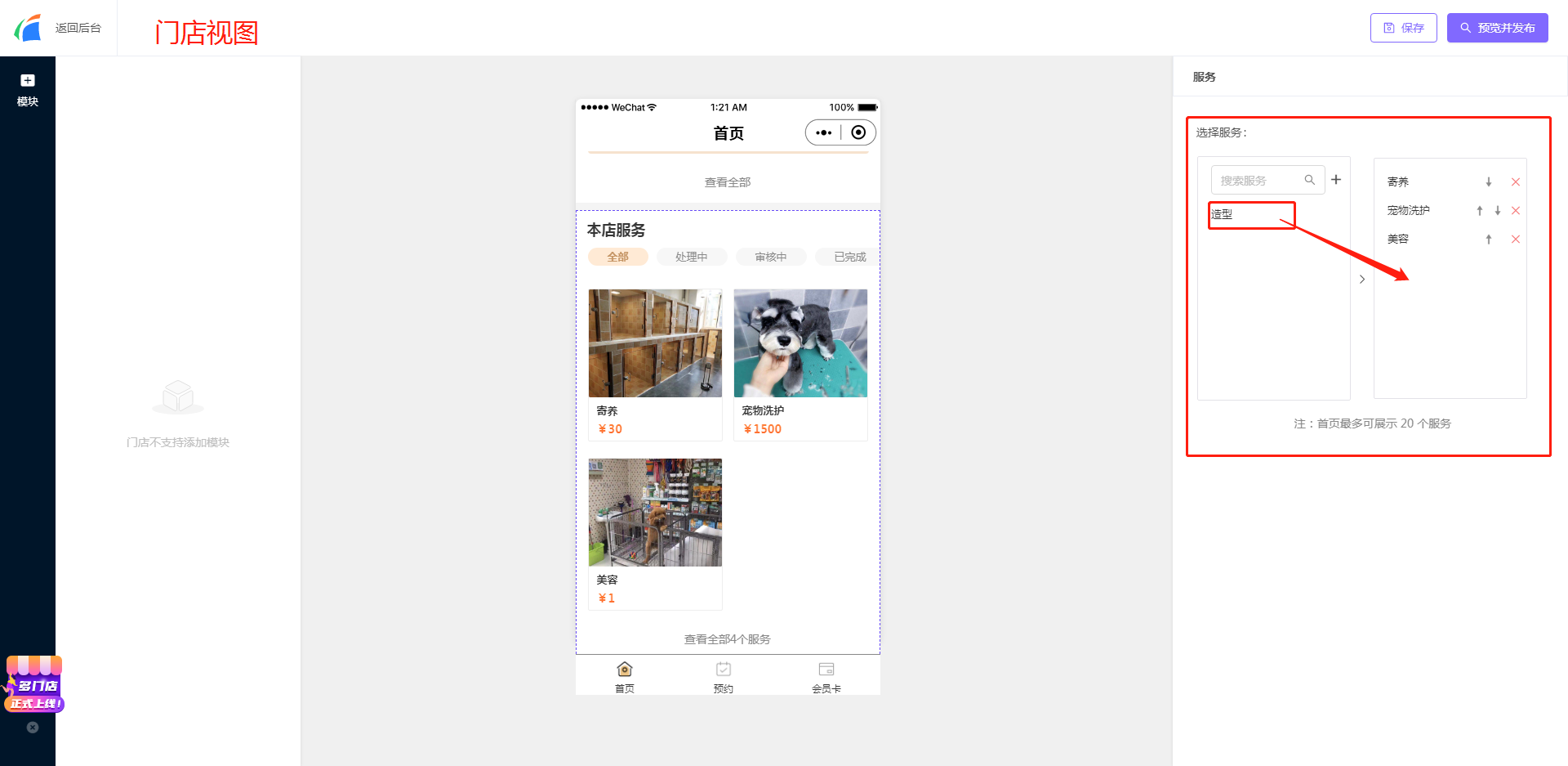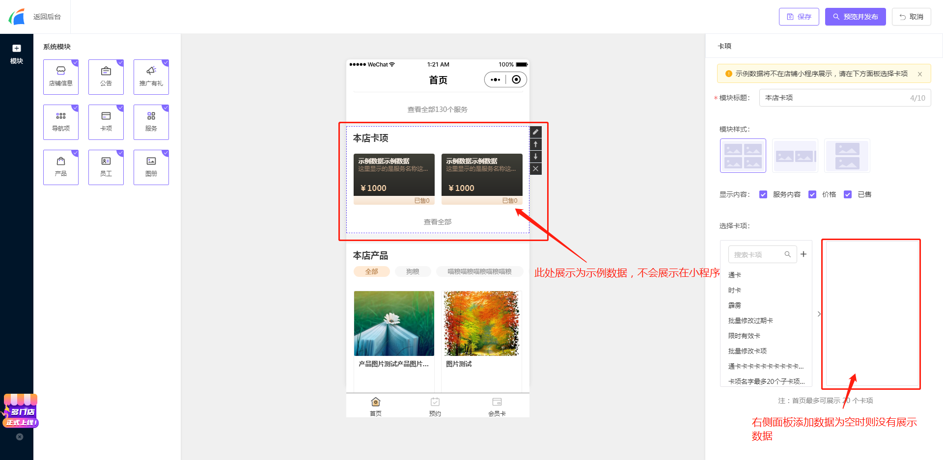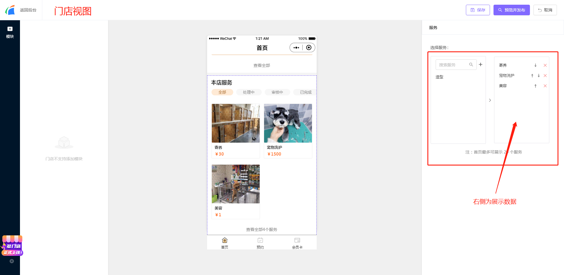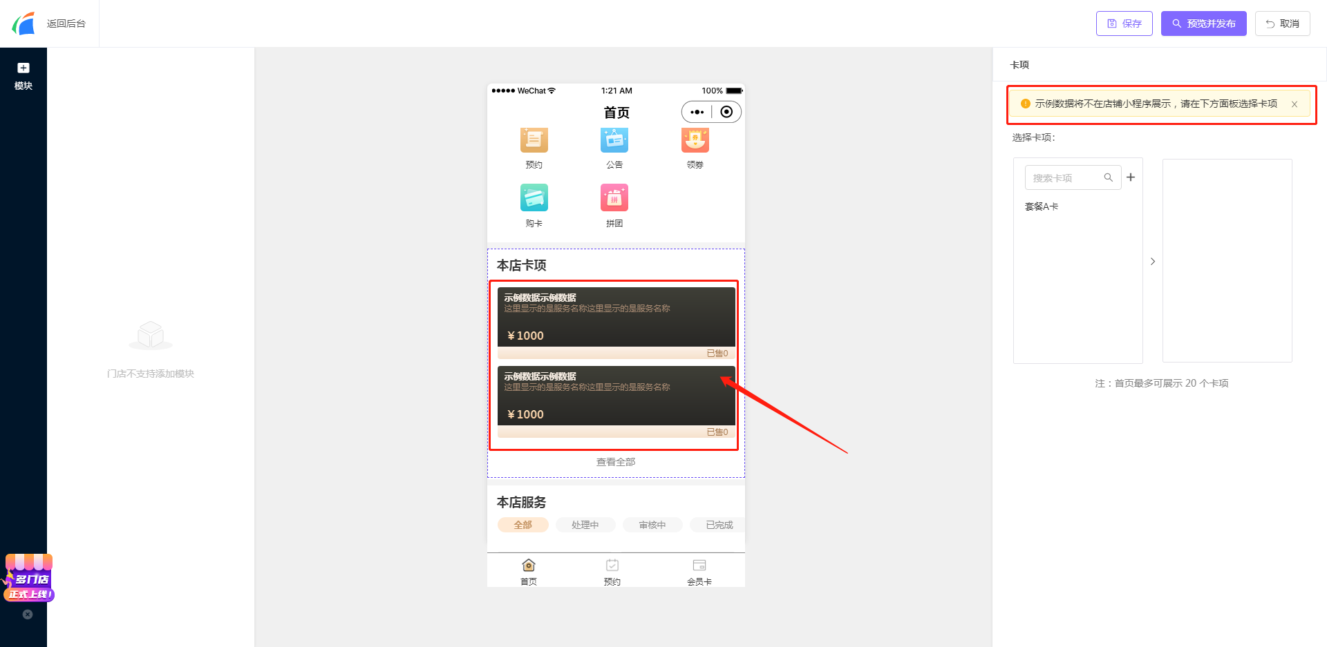 门店展示的服务、卡项、产品、图册等数据需门店自主添加,可前往门店视图查看是否有添加数据