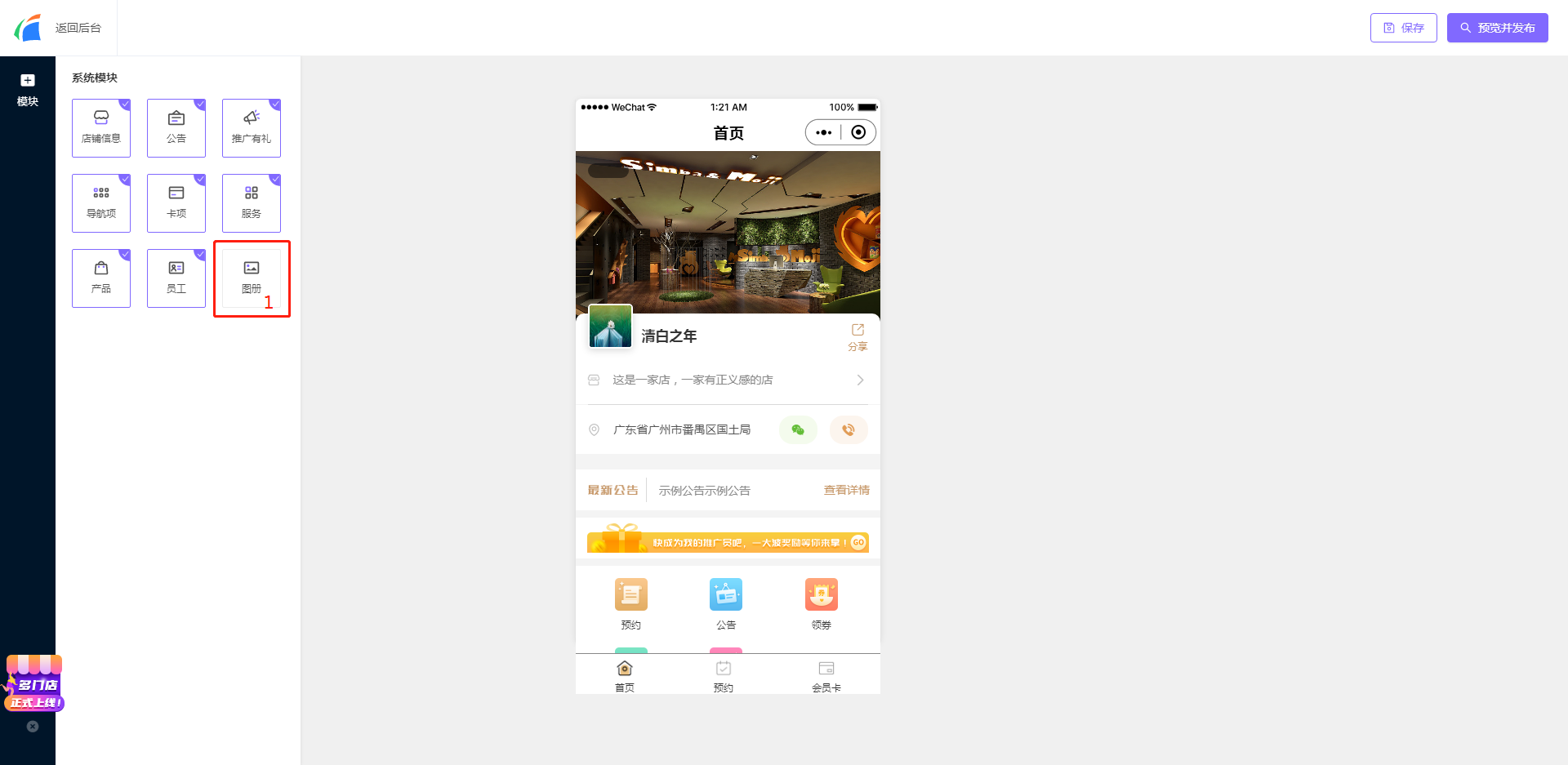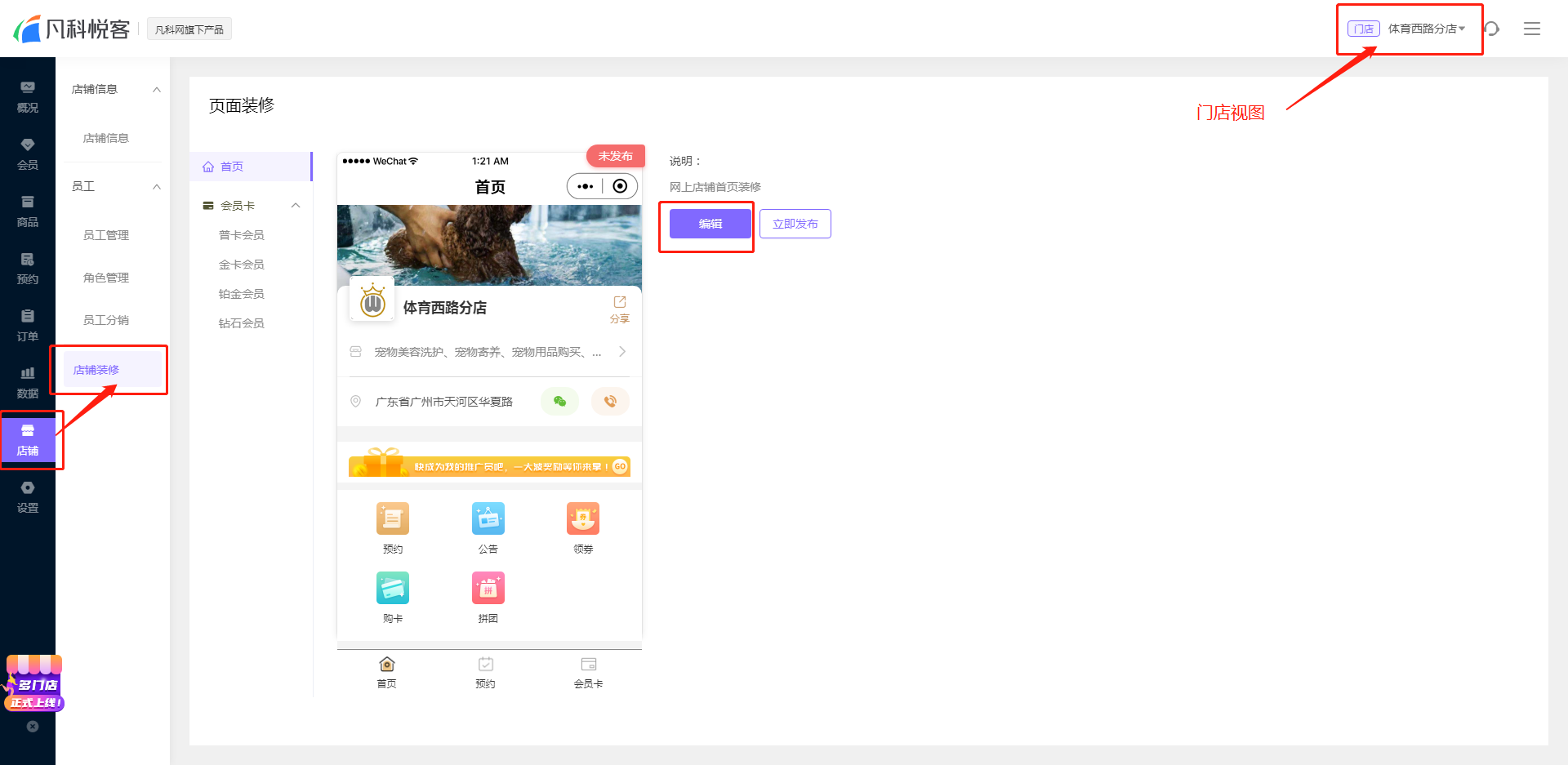 ` `拓展为多门店时,在店铺搭建上,由总部装修完一套店铺模板,应用到旗下所有门店;门店则可自行增加展示服务、产品、卡项、图册等。