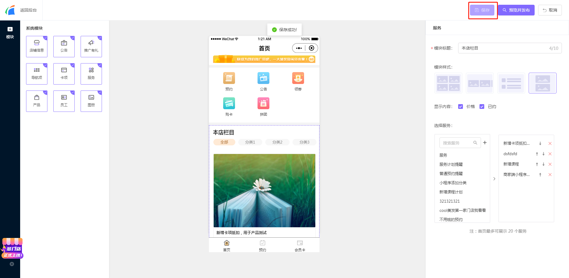 为避免在装修过程中因没有及时发布而丢失装修数据,可以在右上角点击保存;保存后系统会自动将当前的装修数据保存为未发布版本。