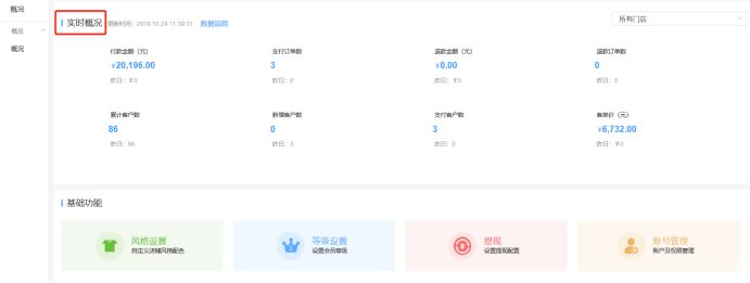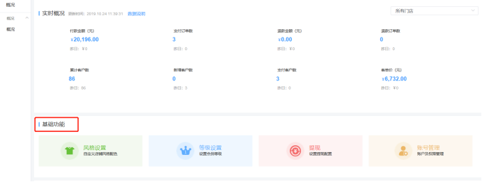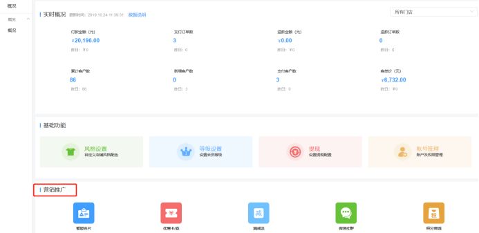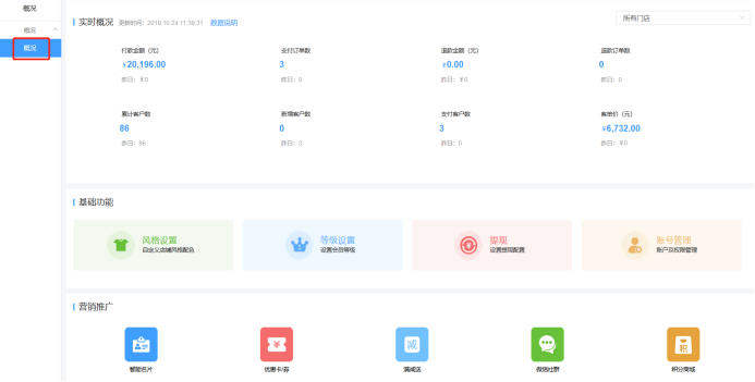 使用单店/多门店的商家,可以通过概况看到付款金额、付款订单数、退款金额、退款订单数、及支付客户数、累计客户数等相关数据,也可以通过基础功能及营销推广直接跳转到相关页面进行设置。