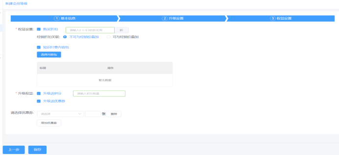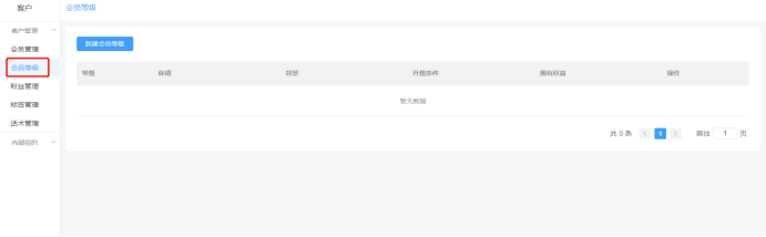 可以进行会员等级的设置(结合SCRM使用),添加会员等级并设置好升级条件及会员权益,此会员等级和收益的等级不相冲突;