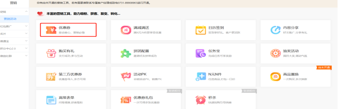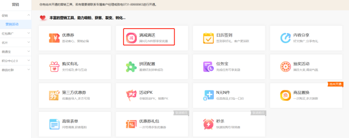 营销推广可以看到基础的营销功能组件:智能名片、优惠卡/券、满减送、微信社群、积分商城;点击该组件可以跳转到相关配置界面;