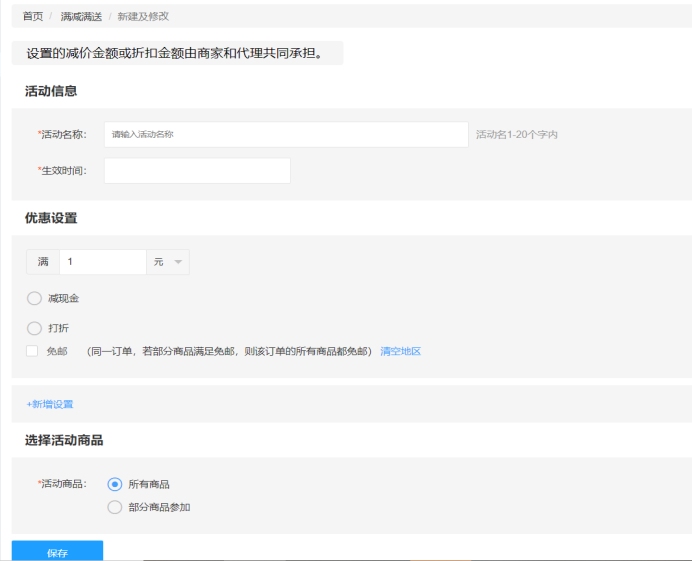 针对聚宝赞商城可以设置满减满送(减现金/打折/包邮)的优惠活动,可针对所有商品/部分商品使用;