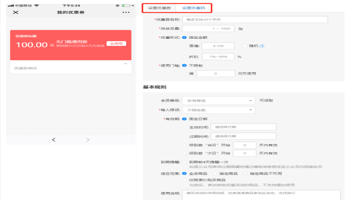可以针对聚宝赞商城设置可使用和分享的优惠券/优惠码活动;