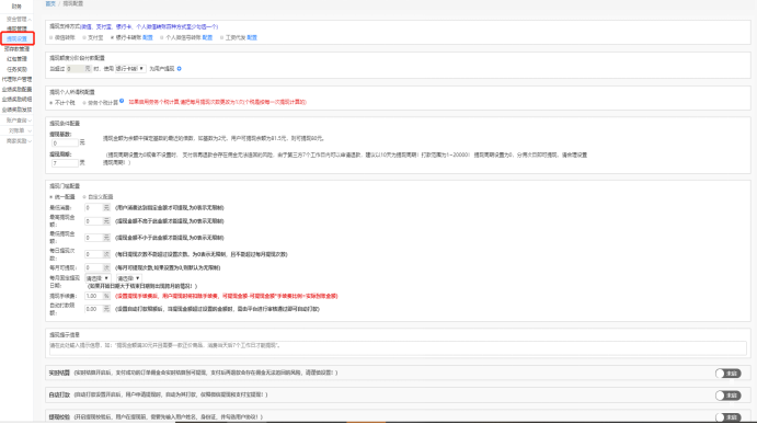 设置提现配置相关信息,目前支持五种提现方式:微信转账、支付宝、银行卡转账、个人微信号转账、工资代发;具体配置见《财务—提现设置》操作文档;