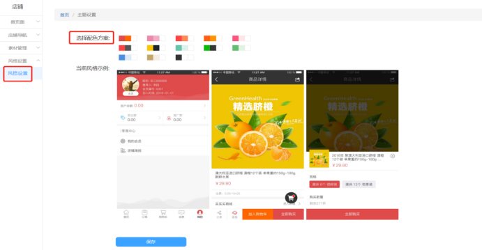 可以自定义店铺风格颜色,设置之后购买和加入购买车、个人中心的界面会随设置的店铺风格颜色变化;