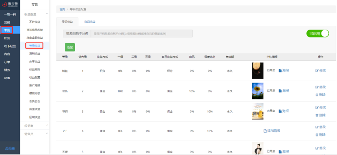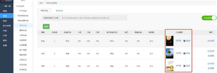 (16)零售—等级收益—个性海报,可以设置每一个零售等级的海报样式,设置方式与推广海报中的一致,设置成功之后会员生成海报,会优先生成这个等级设置的海报,如果没有设置,生成的海报是推广海报中设置的样式;
