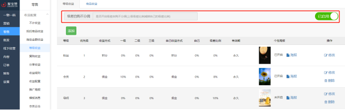 (17)零售—等级收益—上方中的级差自购不分佣:配置有级差功能的商家,才会显示该开关,开启级差开关时,若初级会员和高级会员都设置了级差比例,则初级会员购买,仍然不会分佣,但高级会员只能获得高级会员减去初级会员的级差佣金;