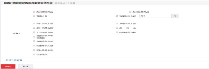 最多可配置10个套餐(或者关系),套餐之内的升级条件是同时满足才能升级(并且关系);