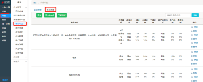 1.聚宝赞后台→零售→等级收益→商品收益→添加: