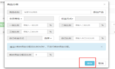 (4)点击“保存”,就可以添加成功该商品的一个等级的收益情况,如果要给该商品在别的等级设置收益比例,操作如上述就可以添加成功;