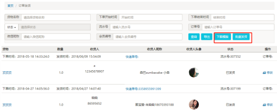 点击发货输入物流信息选择物流公司并填写运单编号,也可批量订单处理;