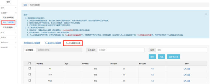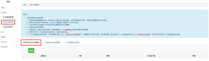推广红包来源可选择个人红包基金池方案(上级在红包开启时间内购买的订单金额乘以个人基金池比例为个人红包基金池余额)/商家奖励方案(商家自定义不同金额不同概率的红包)