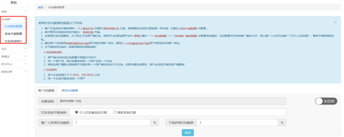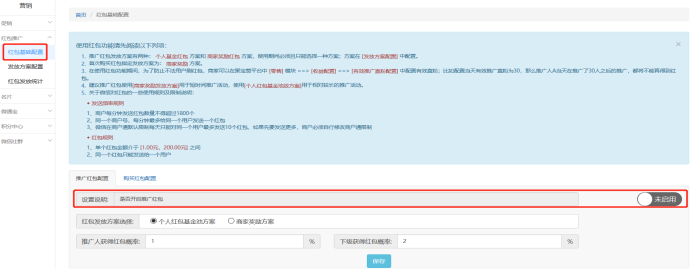 设置推广人获得红包概率(上级获得红包概率)和下级获得红包概率;