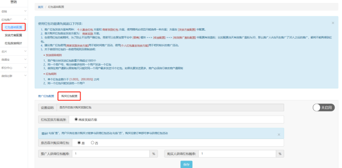 设置推广人获得红包概率(上级获得红包概率)和下级获得红包概率。