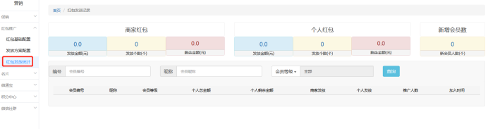 商家可在【聚宝赞后台】—【营销】—【红包发放统计】查看商家奖励发放红包的总金额/剩余金额/发放个数,个人红包基金池发放红包总金额/剩余金额/发放个数,通过红包裂变增加的新粉数和每个人的个人总金额/余额/获得商家奖励红包个数/个人基金池红包个数/推广人数/加入时间等信息。