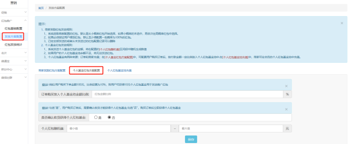 设置个人基金池比例(上级在红包开启时间内购买的订单金额乘以个人基金池比例为个人红包基金池余额);例如:用户购买下单金额100元,比例设置为10%,则用户可获得10元个人红包基金用于发送推广红包;