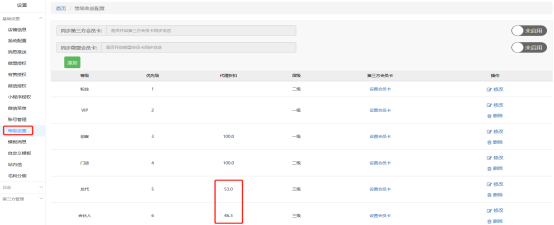 注:代理折扣设置:设置—基础设置—等级设置,点击修改的按钮,设置代理折扣。