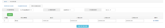 (3)团队销售奖励:针对于最顶级的代理商,会有相应的团队销售奖励,线上统计线下发放。比如针对最顶级合伙人做奖励分红,本人进货额10万/一阶进货额5万/二阶进货额3万奖励销售额的1%,本人进货额15万/一阶进货额10万/二阶进货额5万奖励销售额的1.5%,本人进货额20万/一阶进货额15万/二阶进货额10万奖励销售额的2%,则设置团队销售奖励。