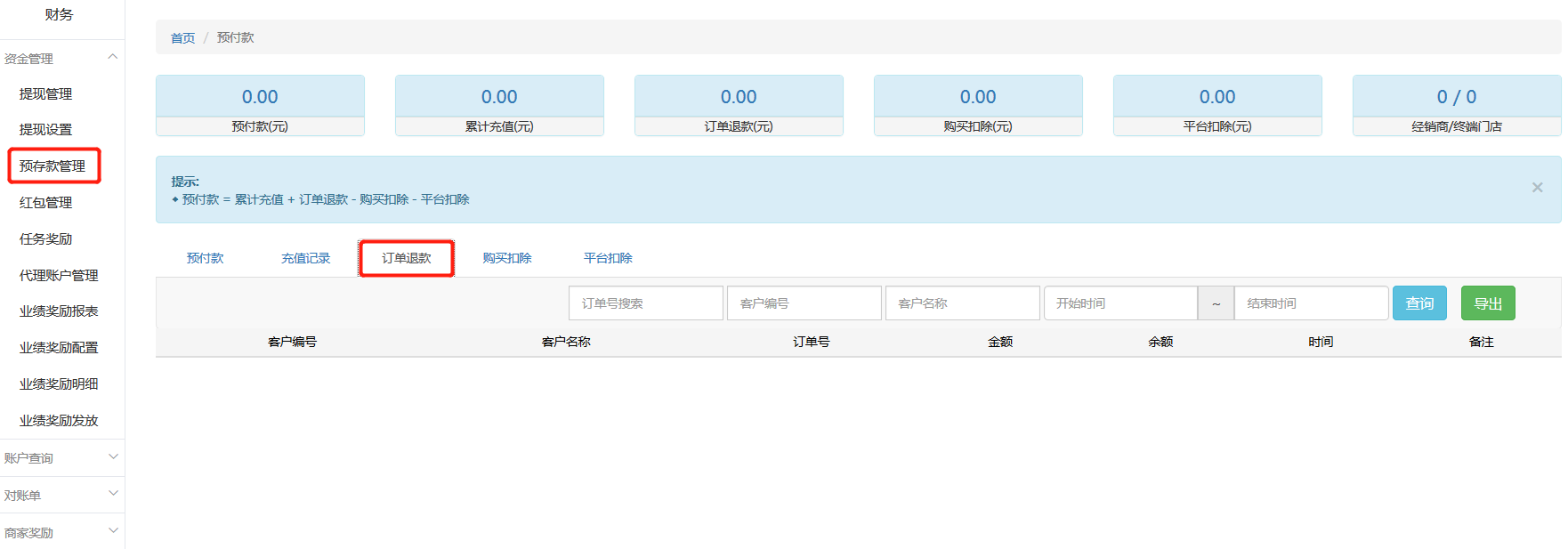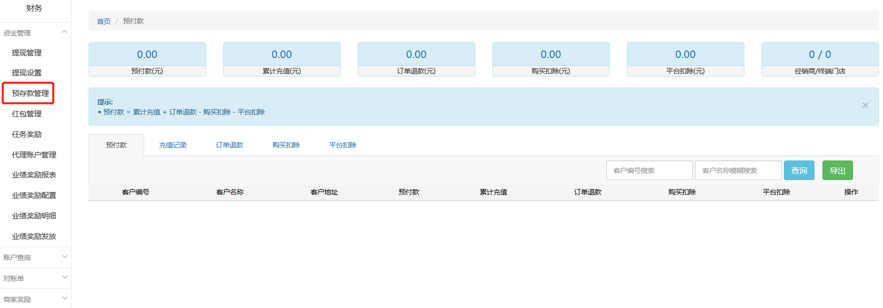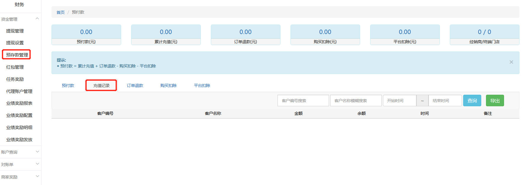 1、预付款:可根据客户编号和名称去查询代理商的累计充值,订单退款及商家扣除等相关信息,支持导出。