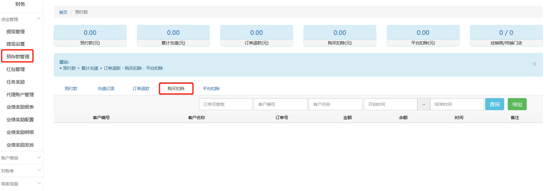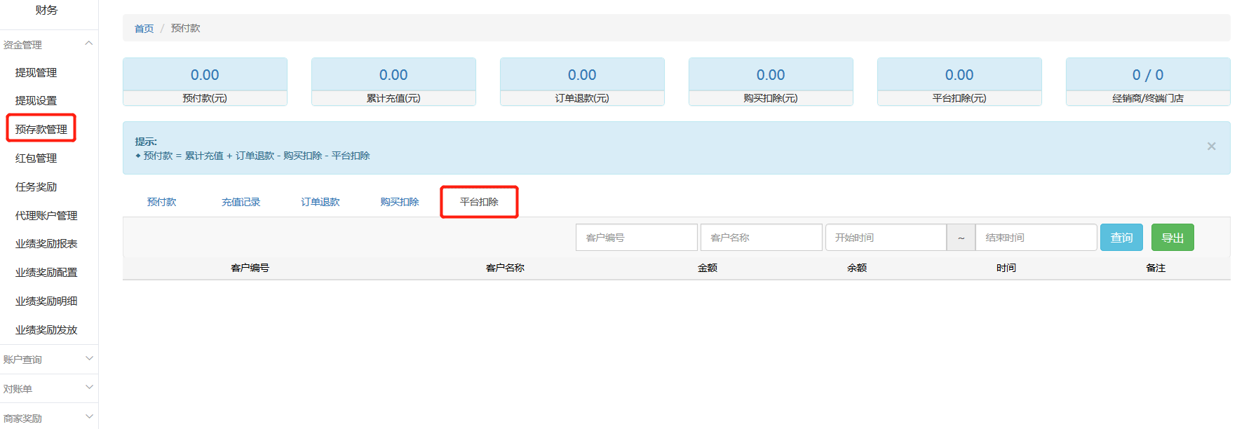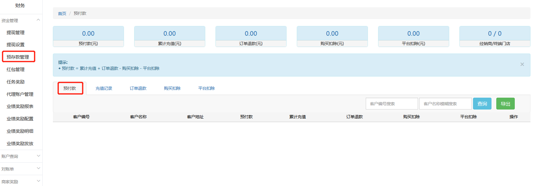 1、预付款:可根据客户编号和名称去查询代理商的累计充值,订单退款及商家扣除等相关信息,支持导出。