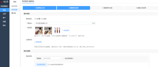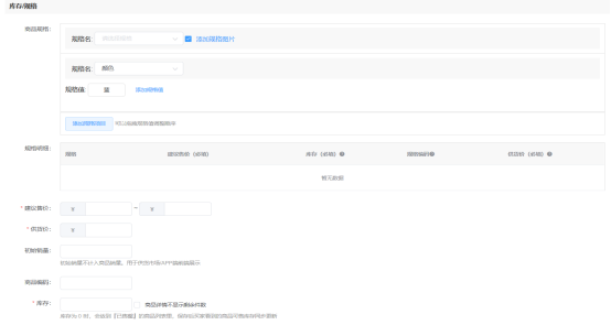 \*建议售价/供货价/初始销量(初始销量不计入商品销量。用于供货市场/APP端前端展示)/商品编码/库存(可设置商品详情页不显示库存件数,库存为 0 时,会放到『已售罄』的商品列表里,保存后买家看到的商品可售库存同步更新)