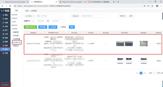 (2)平台方分账账号开通后,进入后台查看供应商登记信息。选择审核状态“未进件”提交银联审核账户资料,开通供货商分账并备案。通过后状态为“签约成功”。
