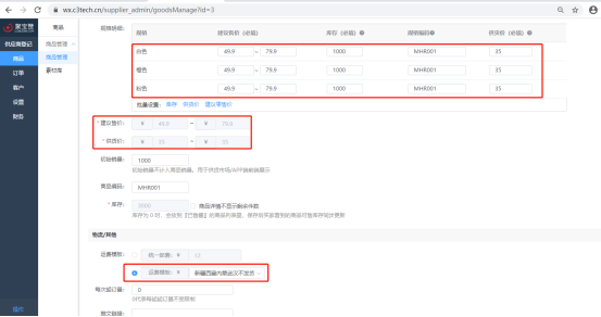 \*规格明细:每个规格可以设置不同的售价、库存、规格编码和供货价;