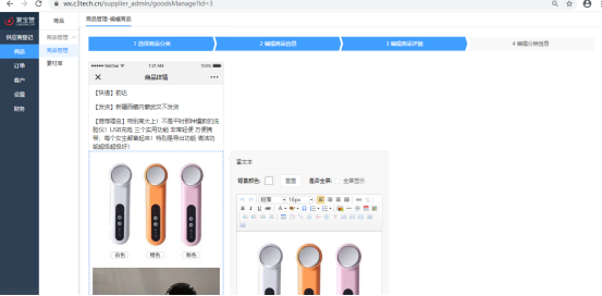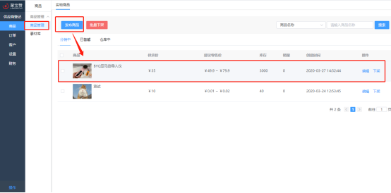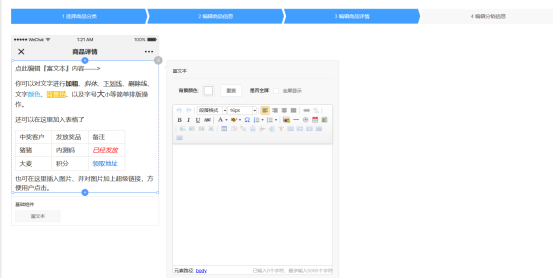 点击商品—商品管理—发布商品—选择商品分类—编辑商品基本信息—编辑商品详情页—编辑分销信息—保存。