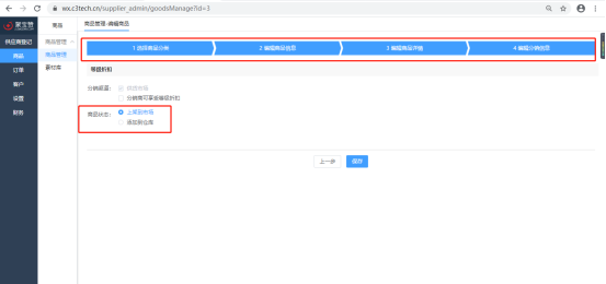 \*商品状态:默认是上架到市场,可选择添加至仓库,后续再上架;