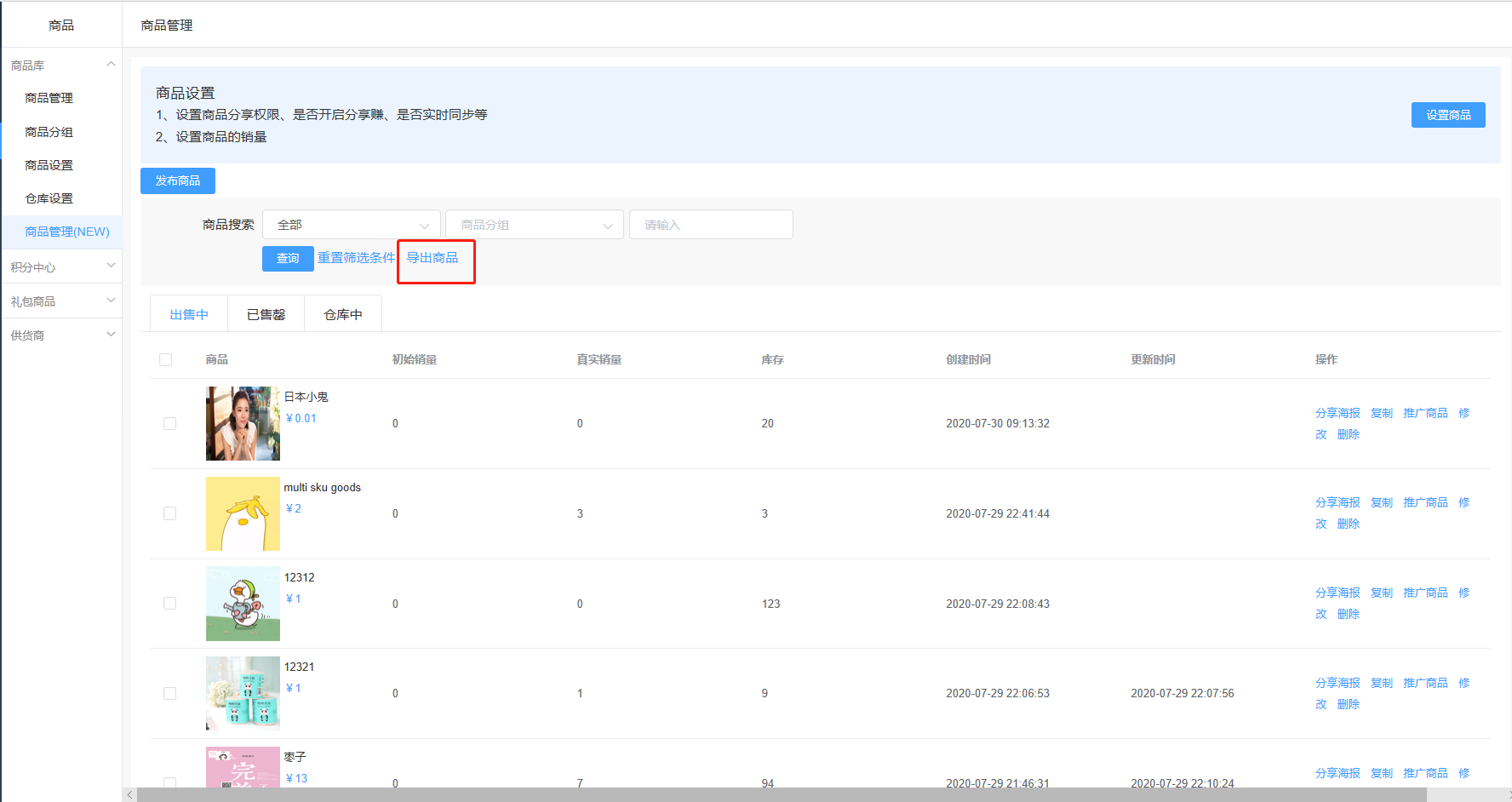 操作路径:商品-商品库-商品管理(New)-导出商品。