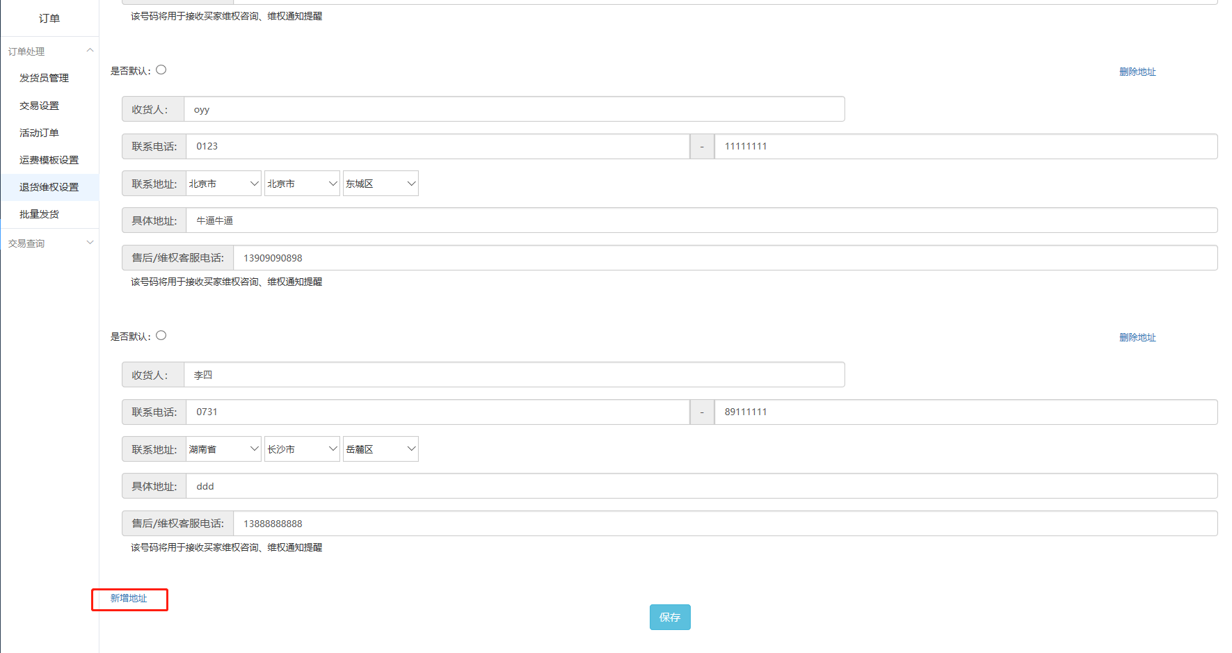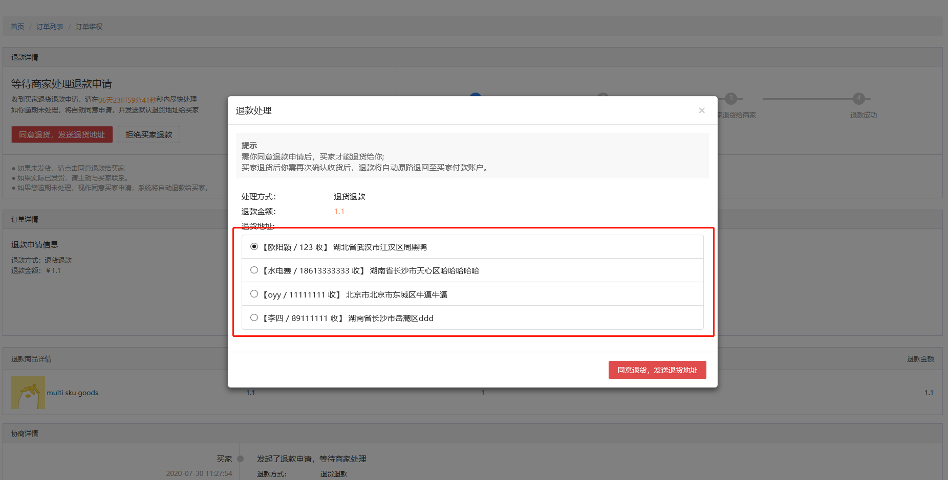 后台可维护多个退货维权地址——商家可在后台设置多个退货地址,在操作用户申请的【退货退款】申请时,可更便捷的将其中某一个退货维权地址发送给用户。