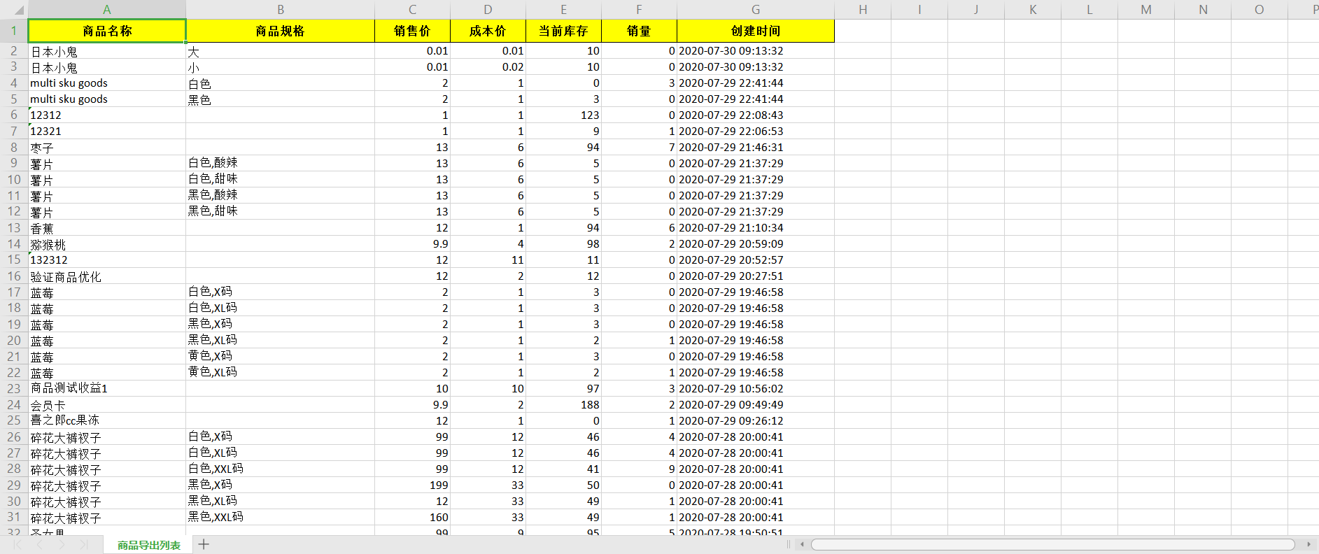 商品报表导出——可导出查询结果中的商品信息,包含商品的SKU、销售价、成本价、真实销量等信息。